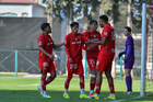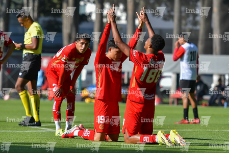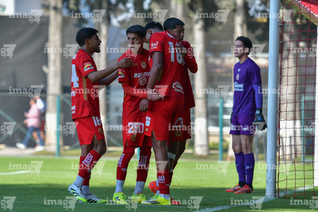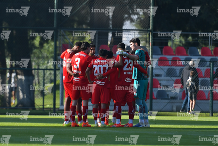 Toluca, Estado de México, 13 de febrero de 2026. Jugadores del Toluca u21 en festejo de gol, durante el partido correspondiente a la jornada 6 del torneo Clausura 2026 de la Liga BBVA MX categoría Sub21, entre los Diablos Rojos del Toluca y los Xolos de Tijuana, celebrado en las Instalaciones de Metepec. Foto: Imago7/ Arturo Hernández