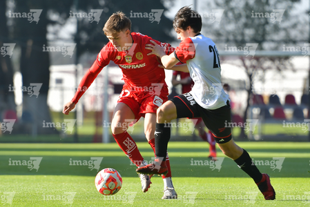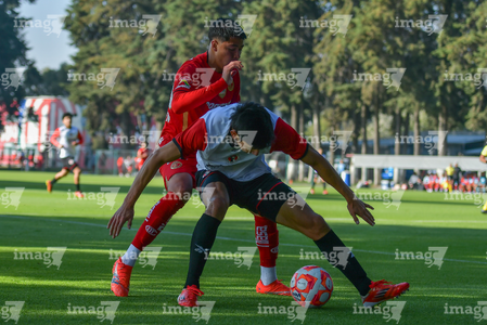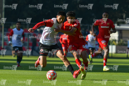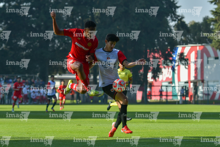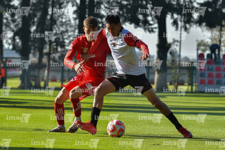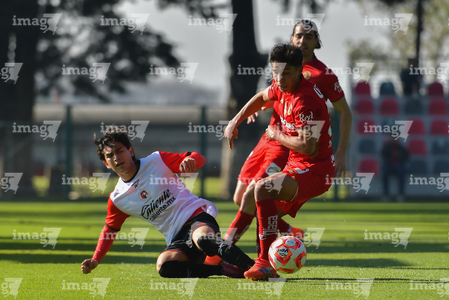 Toluca, Estado de México, 13 de febrero de 2026. Ian Olvera y José Arroyo, durante el partido correspondiente a la jornada 6 del torneo Clausura 2026 de la Liga BBVA MX categoría Sub21, entre los Diablos Rojos del Toluca y los Xolos de Tijuana, celebrado en las Instalaciones de Metepec. Foto: Imago7/ Arturo Hernández