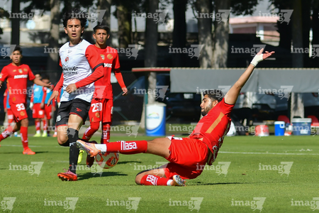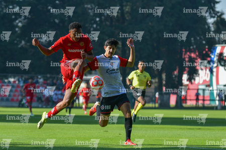 Toluca, Estado de México, 13 de febrero de 2026. Oswaldo Virgen y Alejandro Magallón, durante el partido correspondiente a la jornada 6 del torneo Clausura 2026 de la Liga BBVA MX categoría Sub21, entre los Diablos Rojos del Toluca y los Xolos de Tijuana, celebrado en las Instalaciones de Metepec. Foto: Imago7/ Arturo Hernández