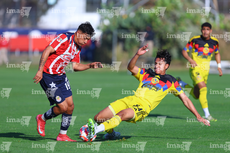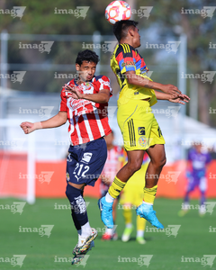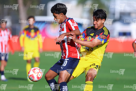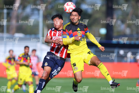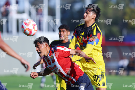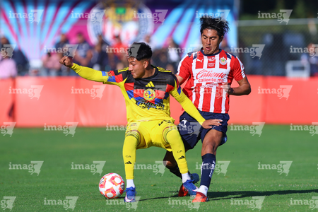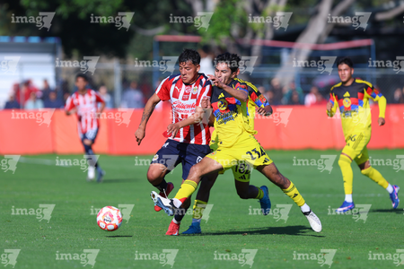 Zapopan, Jalisco, 14 de febrero 2026. Etsgar Cruz y Yohan Orozco, durante el partido correspondiente a la jornada 6 del torneo Clausura 2026 de la Liga BBVA MX categoría Sub21, entre las Chivas Rayadas del Guadalajara y las Águilas del América, realizado en la Cancha Gigantera 2. Foto: Imago7/ Juan Carlos Cubeyro.