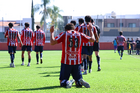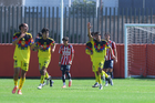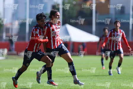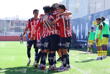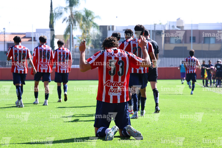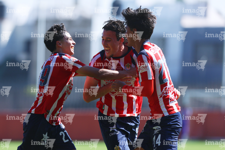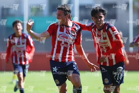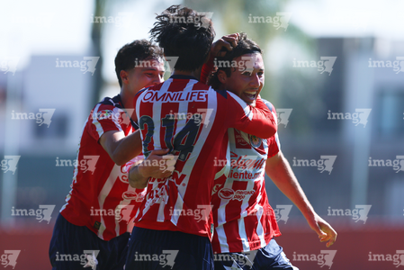 Zapopan, Jalisco, 14 de febrero 2026. Jugadores de Chivas en festejo de gol, durante el partido correspondiente a la jornada 6 del torneo Clausura 2026 de la Liga BBVA MX categoría Sub21, entre las Chivas Rayadas del Guadalajara y las Águilas del América, realizado en la Cancha Gigantera 2. Foto: Imago7/ Juan Carlos Cubeyro.