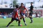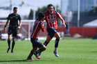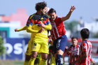 Zapopan, Jalisco, 14 de febrero 2026. Gael Garcia y Andrés Araujo, durante el partido correspondiente a la jornada 6 del torneo Clausura 2026 de la Liga BBVA MX categoría Sub21, entre las Chivas Rayadas del Guadalajara y las Águilas del América, realizado en la Cancha Gigantera 2. Foto: Imago7/ Juan Carlos Cubeyro.