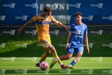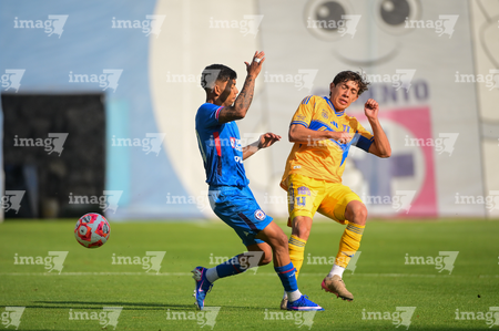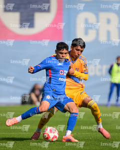 Ciudad de México a 15 de febrero de 2026. Cristian Jiménez y Antonio De María Y Campos, durante el partido correspondiente a la jornada 6 del torneo Clausura 2026 de la Liga BBVA MX categoría Sub21, entre la Máquina Celeste del Cruz Azul y los Tigres de la UANL, realizado en el La Noria. Foto: Imago7/ Alexis Chávez