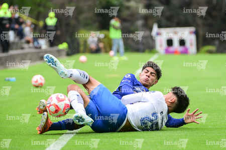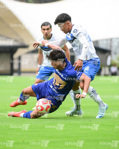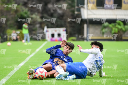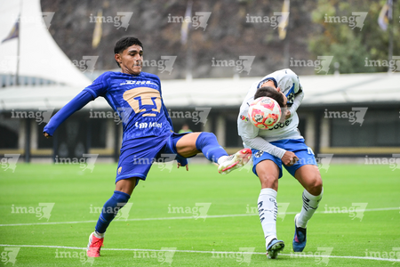 Ciudad de México, 22 de febrero 2026. José Urias y Kevin Borges, durante el partido correspondiente a la jornada 7 del torneo Clausura 2025 de la Liga BBVA MX categoría Sub21, entre los Pumas de la UNAM y los Rayados del Monterrey, realizado en Cantera. Foto: Imago7/ Alexis Chavez