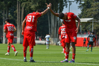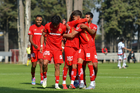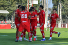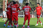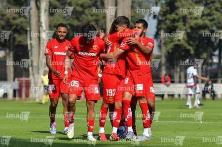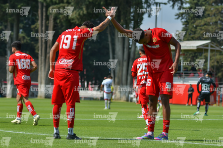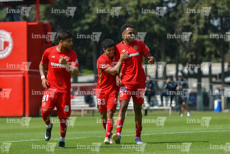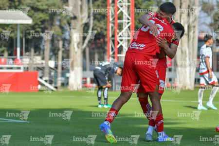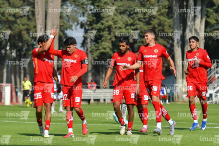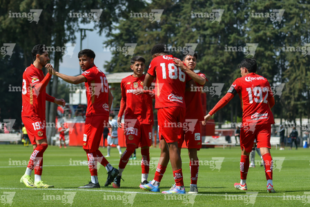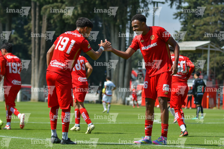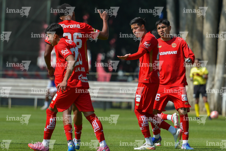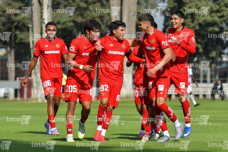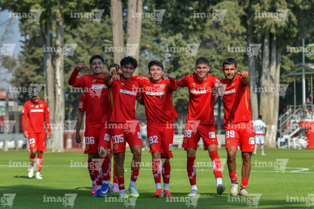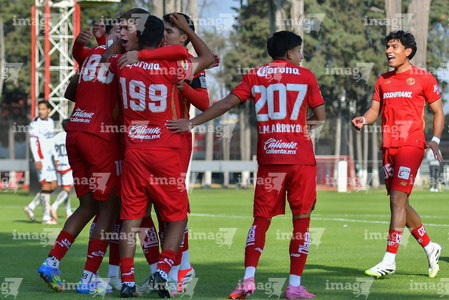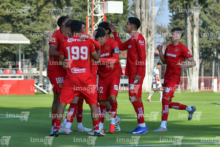 Metepec, Estado de México, 14 de Marzo de 2026. Jugadores del Toluca sub21 en festejo de gol, durante el partido correspondiente a la jornada 11 del torneo Clausura 2026 de la Liga BBVA MX categoría Sub21, entre los Diablos Rojos del Toluca y los Rojinegros del Atlas, realizado en las instalaciones de Metepec. Foto: Imago7/ Arturo Hernández
