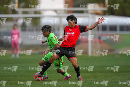 Ciudad Juárez, Chihuahua, 10 de abril de 2026. Brayan Molina e Ian Olvera, durante el partido correspondiente a la jornada 14 del torneo clausura 2026 de la Liga BBVA MX categoría Sub21, entre los Bravos de FC Juárez y los Xolos de Tijuana, realizado en realizado en el Instituto Tecnológico de Ciudad Juárez. Foto: Imago7/ José Zamora