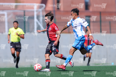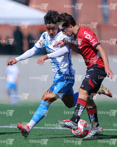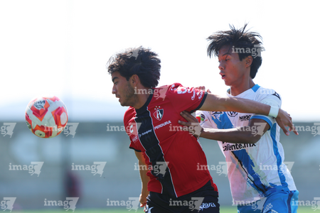 Guadalajara, Jalisco, 09 de enero de 2026. Roberto López Cuadra y Ángel Sevilla, durante el partido correspondiente a la jornada 1 del torneo Clausura 2026 de la Liga BBVA MX categoría Sub19, entre los Rojinegros del Atlas y el Club Puebla, realizado en la Academia AGA. Foto: Imago7/ Juan Carlos Cubeyro.