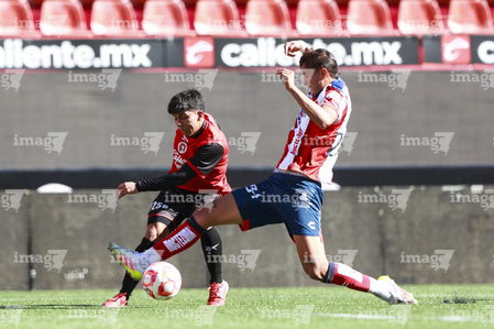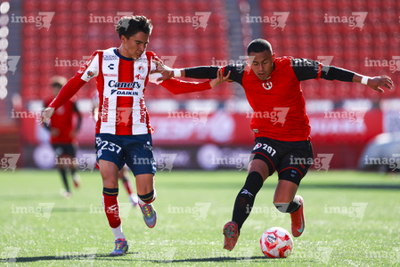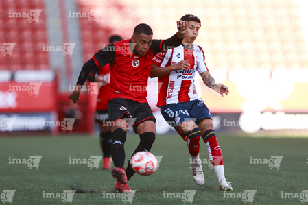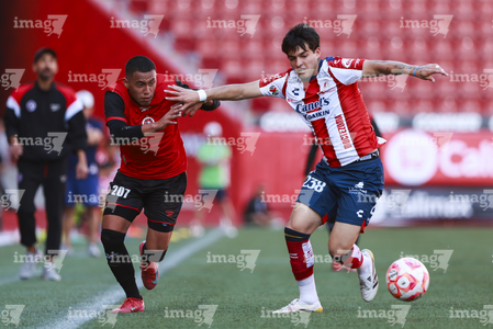 Tijuana, Baja California, 17 de enero de 2026. Alberto Castillo y Juan Hernández, durante el partido correspondiente a la jornada 3 del torneo Clausura 2026 de la Liga BBVA MX categoría Sub19, entre los Xolos de Tijuana y el Atlético de San Luis, realizado en el estadio Caliente. Foto: Imago7/Alejandro Gutiérrez Mora