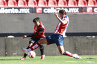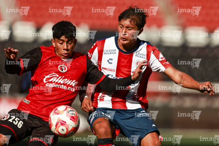 Tijuana, Baja California, 17 de enero de 2026. Christopher Monjarás y Alberto Castillo, durante el partido correspondiente a la jornada 3 del torneo Clausura 2026 de la Liga BBVA MX categoría Sub19, entre los Xolos de Tijuana y el Atlético de San Luis, realizado en el estadio Caliente. Foto: Imago7/Alejandro Gutiérrez Mora