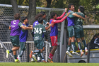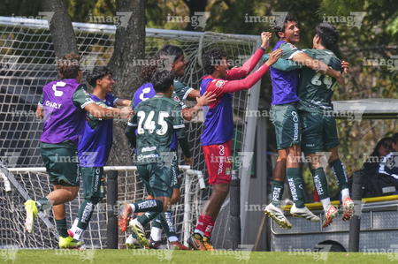 Ciudad de México, 18 de enero 2026. Jugadores de León sub19 en festejo de gol, durante el partido correspondiente a la jornada 3 del torneo Clausura 2026 de la Liga BBVA MX categoría Sub19, entre los Pumas de la UNAM y los Esmeraldas del León, realizado en Cantera. Foto: Imago7/ Carlos Vargas