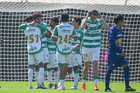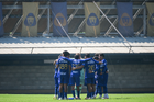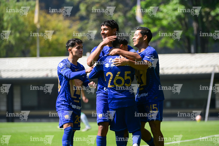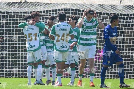 Ciudad de México a 30 de enero 2026. Jugadores de Santos en festejo de gol, durante el partido correspondiente a la jornada 4 del torneo Clausura 2026 de la Liga BBVA MX categoría Sub19, entre los Pumas de la UNAM y los Guerreros de Santos Laguna, realizado en Cantera. Foto: Imago7/Alexis Chávez