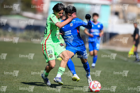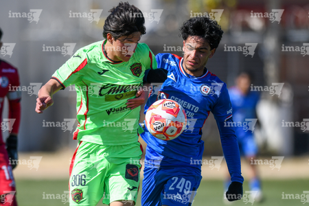 Ciudad Juárez, Chihuahua, 30 de enero de 2026. Juan López y Yazziel Cuenca, durante el partido correspondiente a la jornada 4 del torneo Clausura 2026 de la Liga BBVA MX categoría Sub19, entre los Bravos de FC Juárez y la Máquina Celeste del Cruz Azul, realizado en realizado en el Instituto Tecnológico de Ciudad Juárez. Foto: Imago7/ Alejandro Rodríguez