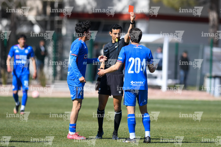 Ciudad Juárez, Chihuahua, 30 de enero de 2026. Carlos Gael Trujillo, Arbitro Central, muestra tarjeta de expulsión a Jonathan Meza, durante el partido correspondiente a la jornada 4 del torneo Clausura 2026 de la Liga BBVA MX categoría Sub19, entre los Bravos de FC Juárez y la Máquina Celeste del Cruz Azul, realizado en realizado en el Instituto Tecnológico de Ciudad Juárez. Foto: Imago7/ Alejandro Rodríguez
