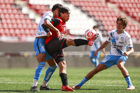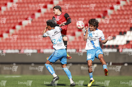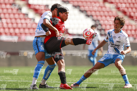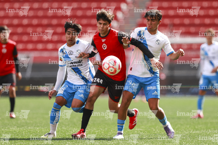 Tijuana, Baja California, 06 de febrero 2026. Santiago Cruz, Adhiel Carrillo, y Christopher Rodríguez, durante el partido correspondiente a la jornada 5 del torneo Clausura 2026 de la Liga BBVA MX categoría Sub19, entre los Xolos de Tijuana y el Club Puebla, celebrado en el estadio Caliente. Foto: Imago7/Alejandro Gutiérrez Mora