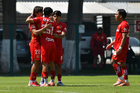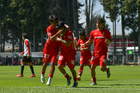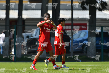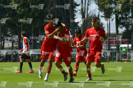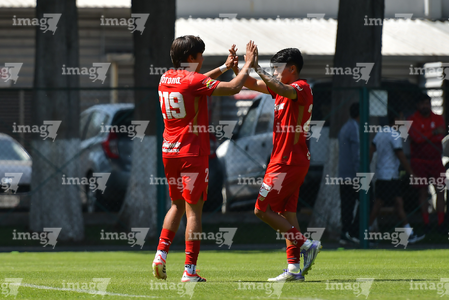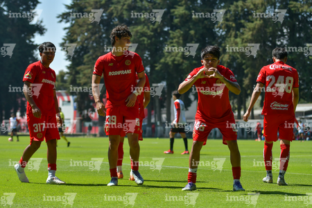 Toluca, Estado de México, 13 de febrero de 2026. Jugadores del Toluca sub19 en festejo de gol, durante el partido correspondiente a la jornada 6 del torneo Clausura 2026 de la Liga BBVA MX categoría Sub19, entre los Diablos Rojos del Toluca y los Xolos de Tijuana, celebrado en las Instalaciones de Metepec. Foto: Imago7/ Arturo Hernández