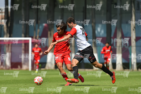 Toluca, Estado de México, 13 de febrero de 2026. Alberto Castillo y Cedric Sánchez, durante el partido correspondiente a la jornada 6 del torneo Clausura 2026 de la Liga BBVA MX categoría Sub19, entre los Diablos Rojos del Toluca y los Xolos de Tijuana, celebrado en las Instalaciones de Metepec. Foto: Imago7/ Arturo Hernández