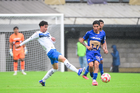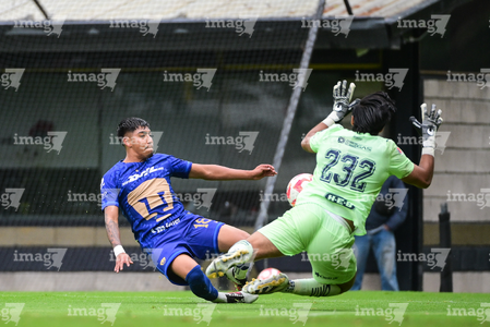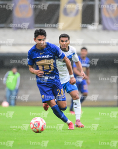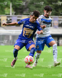 Ciudad de México, 22 de febrero 2026. Jonathan Flores y Oscar Contreras, durante el partido correspondiente a la jornada 12 del torneo Clausura 2025 de la Liga BBVA MX categoría Sub19, entre los Pumas de la UNAM y los Rayados del Monterrey, realizado en Cantera. Foto: Imago7/ Alexis Chavez