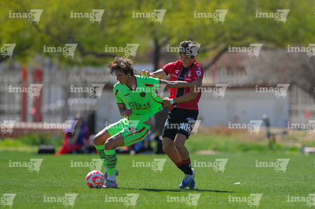 Ciudad Juárez, Chihuahua, 27 de febrero de 2026. Yerevan Barron y Noe Mota, durante el partido correspondiente a la jornada 8 del torneo Clausura 2026 de la Liga BBVA MX categoría Sub19, entre los Bravos de FC Juárez y los Rojinegros del Atlas, realizado en realizado en el Instituto Tecnológico de Ciudad Juárez. Foto: Imago7/ José Zamora