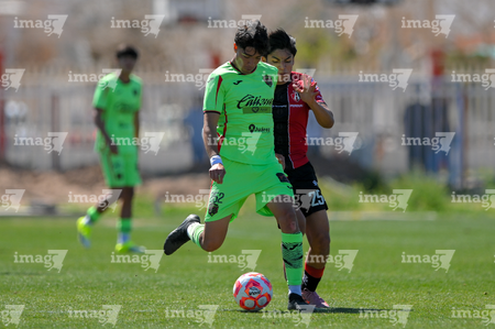 Ciudad Juárez, Chihuahua, 27 de febrero de 2026. Aldo Navarro y Emilio García, durante el partido correspondiente a la jornada 8 del torneo Clausura 2026 de la Liga BBVA MX categoría Sub19, entre los Bravos de FC Juárez y los Rojinegros del Atlas, realizado en realizado en el Instituto Tecnológico de Ciudad Juárez. Foto: Imago7/ José Zamora