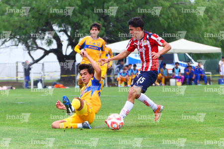 Monterrey, Nuevo León, 11 de abril de 2025. Jonathan Gallardo (D), durante el partido correspondiente a la jornada 14 del torneo Clausura 2026 de la Liga BBVA MX categoría Sub19, entre los Tigres de la UANL y las Chivas Rayadas de Guadalajara realizado en Zuazua. Foto: Imago7/David Arzamendi