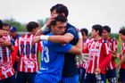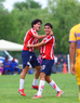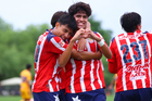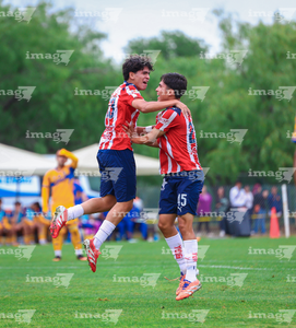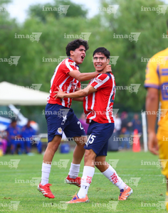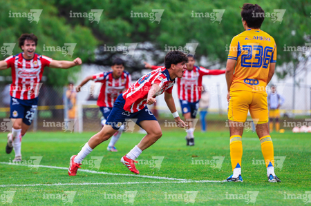 Monterrey, Nuevo León, 11 de abril de 2025. Jonathan Gallardo en festejo de gol, durante el partido correspondiente a la jornada 14 del torneo Clausura 2026 de la Liga BBVA MX categoría Sub19, entre los Tigres de la UANL y las Chivas Rayadas de Guadalajara realizado en Zuazua. Foto: Imago7/David Arzamendi