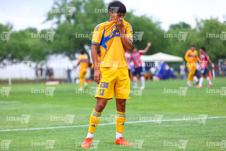 Monterrey, Nuevo León, 11 de abril de 2025. Miguel Sandoval en lamento, durante el partido correspondiente a la jornada 14 del torneo Clausura 2026 de la Liga BBVA MX categoría Sub19, entre los Tigres de la UANL y las Chivas Rayadas de Guadalajara realizado en Zuazua. Foto: Imago7/David Arzamendi