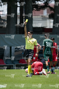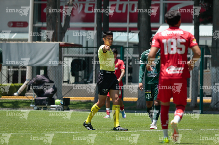 Metepec, Estado de México, 25 de abril de 2026. Jonatan Abdiel Romero Olivares, árbitro central. muestra tarjeta amarilla de amonestación, durante el partido correspondiente a la jornada 17 del torneo Clausura 2026 de la Liga BBVA MX categoría Sub19, entre los Diablos Rojos del Toluca y los Esmeraldas del León, realizado en las instalaciones de Metepec. Foto: Imago7/Daniel Arriaga