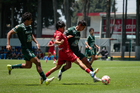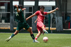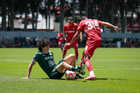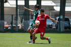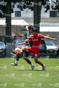 Metepec, Estado de México, 25 de abril de 2026. César Díaz y Michael Corona, durante el partido correspondiente a la jornada 17 del torneo Clausura 2026 de la Liga BBVA MX categoría Sub19, entre los Diablos Rojos del Toluca y los Esmeraldas del León, realizado en las instalaciones de Metepec. Foto: Imago7/Daniel Arriaga
