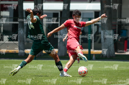 Metepec, Estado de México, 25 de abril de 2026. Hassem Zarur y José Villalobos, durante el partido correspondiente a la jornada 17 del torneo Clausura 2026 de la Liga BBVA MX categoría Sub19, entre los Diablos Rojos del Toluca y los Esmeraldas del León, realizado en las instalaciones de Metepec. Foto: Imago7/Daniel Arriaga