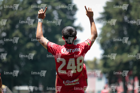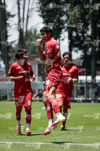 Metepec, Estado de México, 25 de abril de 2026. Jared Figueroa en festejo de gol , durante el partido correspondiente a la jornada 17 del torneo Clausura 2026 de la Liga BBVA MX categoría Sub19, entre los Diablos Rojos del Toluca y los Esmeraldas del León, realizado en las instalaciones de Metepec. Foto: Imago7/Daniel Arriaga