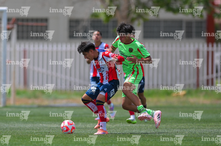 Ciudad Juárez, Chihuahua, 25 de abril de 2026. Eder Cruz y Xavier Madrigal, durante el partido correspondiente a la jornada 17 del torneo Clausura 2026 de la Liga BBVA MX categoría Sub19, entre los Bravos de FC Juárez y el Atlético San Luis, realizado en realizado en el Instituto Tecnológico de Ciudad Juárez. Foto: Imago7/ José Zamora