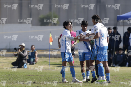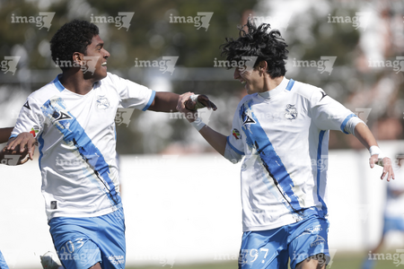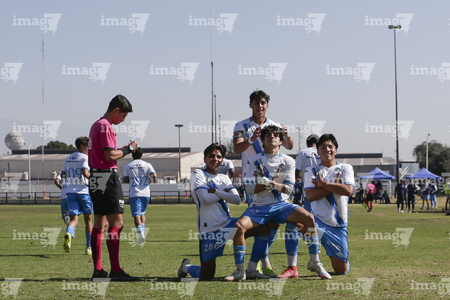 Puebla, Puebla, 11 de enero de 2026. Jugadores del Club Puebla en festejo de gol, durante el partido correspondiente a la jornada 1 del torneo Clausura 2026 de la Liga BBVA MX categoría Sub 17, entre el Club Puebla y los Tuzos del Pachuca, realizado en el Club Alpha. Foto: Imago7/