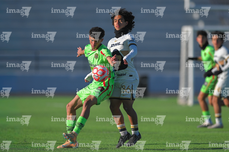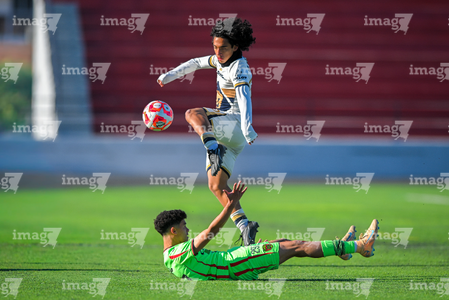 Ciudad Juárez, Chihuahua, 10 de enero de 2026. Rogelio Carreón y Tadeo Torres, durante el partido correspondiente a la jornada 1 del torneo Clausura 2026 de la Liga BBVA MX categoría Sub17, entre los Bravos de FC Juárez y los Pumas de la UNAM, realizado en realizado en el Estadio 8 de Diciembre. Foto: Imago7/ José Zamora