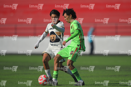 Ciudad Juárez, Chihuahua, 10 de enero de 2026. Luis Gordillo y Sebastián Padilla, durante el partido correspondiente a la jornada 1 del torneo Clausura 2026 de la Liga BBVA MX categoría Sub17, entre los Bravos de FC Juárez y los Pumas de la UNAM, realizado en realizado en el Estadio 8 de Diciembre. Foto: Imago7/ José Zamora