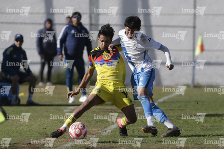 Puebla, Puebla a 7 de febrero de 2026. Bryan Rodríguez y Andy Aquino, durante el partido correspondiente a la jornada 5 del torneo Clausura 2026 de la Liga BBVA MX categoría Sub 17, entre el Club Puebla y las Águilas del América, realizado en el Club Alpha. Foto: Imago7/Mireya Novo