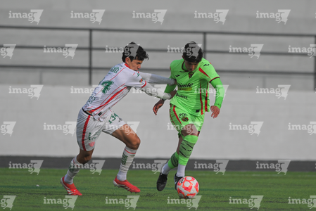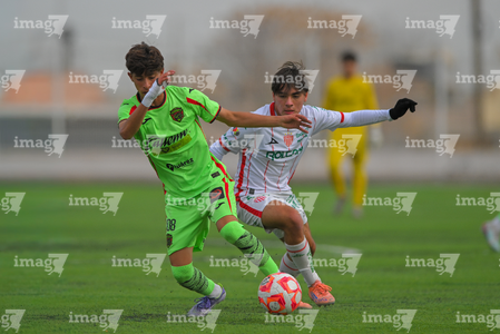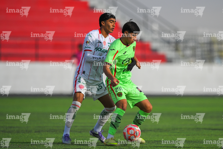 Ciudad Juárez, Chihuahua, 7 de febrero de 2026. Dilan Magaña y César Molina, durante el partido correspondiente a la jornada 5 del torneo Clausura 2026 de la Liga BBVA MX categoría Sub17, entre los Bravos de FC Juárez y los Rayos del Necaxa, realizado en realizado en el Estadio 8 de Diciembre. Foto: Imago7/ José Zamora