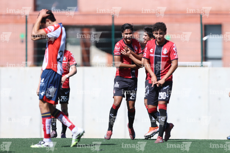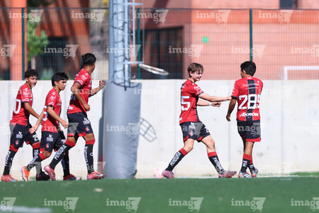 Guadalajara, Jalisco, 20 de marzo de 2026. Jugadores de Atlas en festejo, durante el partido correspondiente a la jornada 11 del torneo Clausura 2026 de la Liga BBVA MX categoría Sub17, entre los Rojinegros del Atlas y el Atlético San Luis, realizado en la Academia AGA. Foto: Imago7/ Juan Carlos Cubeyro.