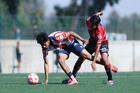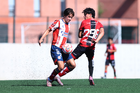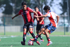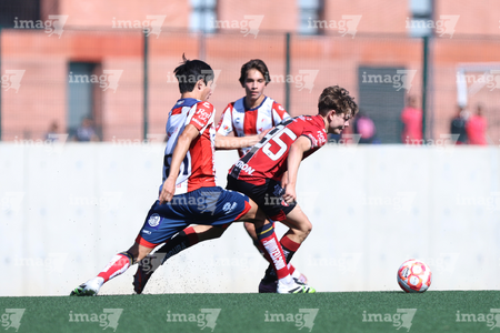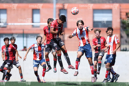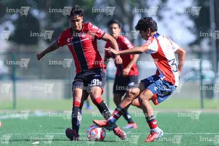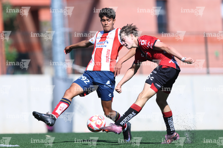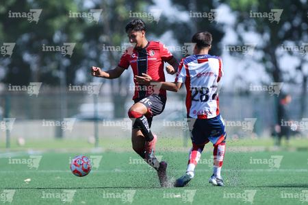 Guadalajara, Jalisco, 20 de marzo de 2026. Diego Rodríguez y Brayan Martínez, durante el partido correspondiente a la jornada 11 del torneo Clausura 2026 de la Liga BBVA MX categoría Sub17, entre los Rojinegros del Atlas y el Atlético San Luis, realizado en la Academia AGA. Foto: Imago7/ Juan Carlos Cubeyro.
