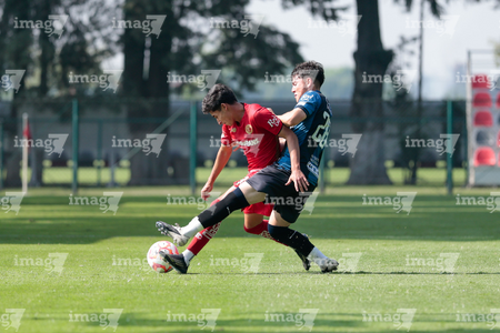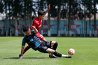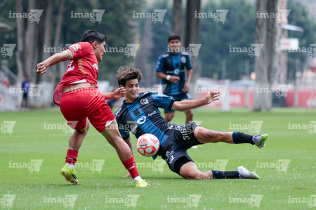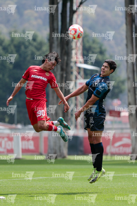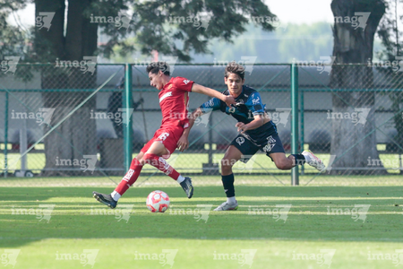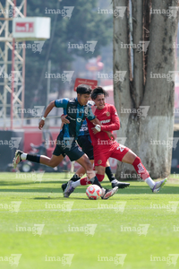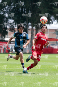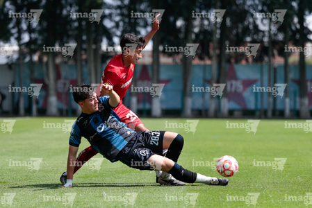 Metepec, Estado de México, 22 de abril de 2026. Leonardo Guerrero y Angel López, durante el partido correspondiente a la jornada 13 del torneo Clausura 2026 de la Liga BBVA MX categoría Sub17, entre los Diablos Rojos del Toluca y los Gallos Blancos del Querétaro, realizado en las instalaciones de Metepec. Foto: Imago7/Daniel Arriaga