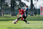 Metepec, Estado de México, 22 de abril de 2026. Ian Rico y Gustavo Cervantes, durante el partido correspondiente a la jornada 13 del torneo Clausura 2026 de la Liga BBVA MX categoría Sub17, entre los Diablos Rojos del Toluca y los Gallos Blancos del Querétaro, realizado en las instalaciones de Metepec. Foto: Imago7/Daniel Arriaga