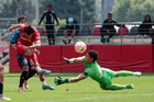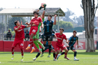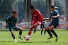 Metepec, Estado de México, 22 de abril de 2026. Marvin Romero, tira y falla durante el partido correspondiente a la jornada 13 del torneo Clausura 2026 de la Liga BBVA MX categoría Sub17, entre los Diablos Rojos del Toluca y los Gallos Blancos del Querétaro, realizado en las instalaciones de Metepec. Foto: Imago7/Daniel Arriaga