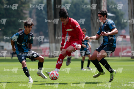 Metepec, Estado de México, 22 de abril de 2026. Diego Escalante, Gustavo Cervantes y Gael Beltran, durante el partido correspondiente a la jornada 13 del torneo Clausura 2026 de la Liga BBVA MX categoría Sub17, entre los Diablos Rojos del Toluca y los Gallos Blancos del Querétaro, realizado en las instalaciones de Metepec. Foto: Imago7/Daniel Arriaga