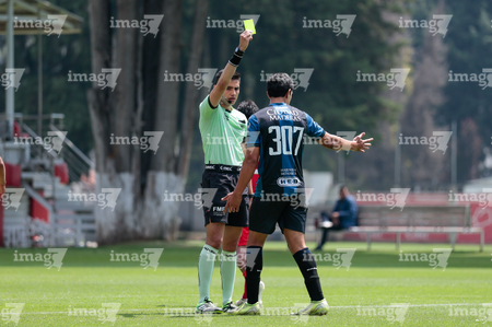 Metepec, Estado de México, 22 de abril de 2026. Ángel Manuel Monroy Castro, árbitro central, muestra tarjeta amarilla de amonestación a Gael Beltran, durante el partido correspondiente a la jornada 13 del torneo Clausura 2026 de la Liga BBVA MX categoría Sub17, entre los Diablos Rojos del Toluca y los Gallos Blancos del Querétaro, realizado en las instalaciones de Metepec. Foto: Imago7/Daniel Arriaga