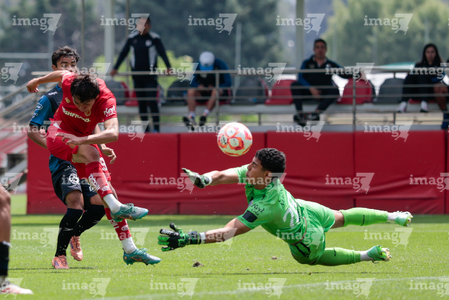 Metepec, Estado de México, 22 de abril de 2026. Leonardo González detiene. centro, durante el partido correspondiente a la jornada 13 del torneo Clausura 2026 de la Liga BBVA MX categoría Sub17, entre los Diablos Rojos del Toluca y los Gallos Blancos del Querétaro, realizado en las instalaciones de Metepec. Foto: Imago7/Daniel Arriaga