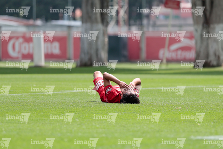 Metepec, Estado de México, 22 de abril de 2026. Marvin Romero en lamento, durante el partido correspondiente a la jornada 13 del torneo Clausura 2026 de la Liga BBVA MX categoría Sub17, entre los Diablos Rojos del Toluca y los Gallos Blancos del Querétaro, realizado en las instalaciones de Metepec. Foto: Imago7/Daniel Arriaga