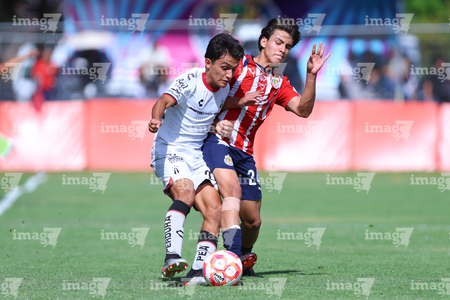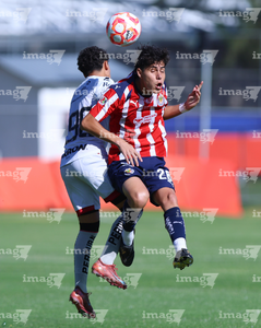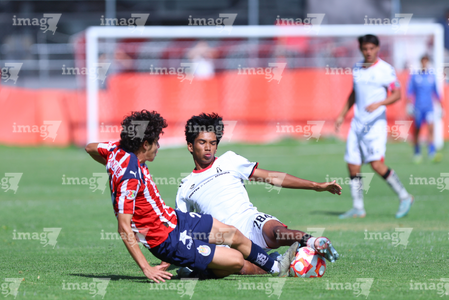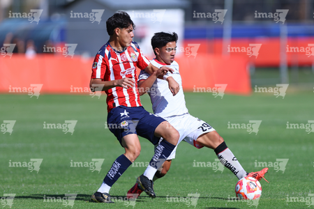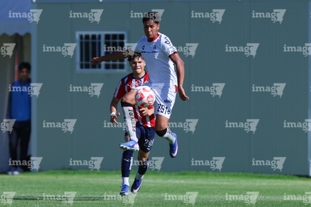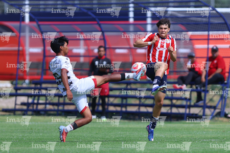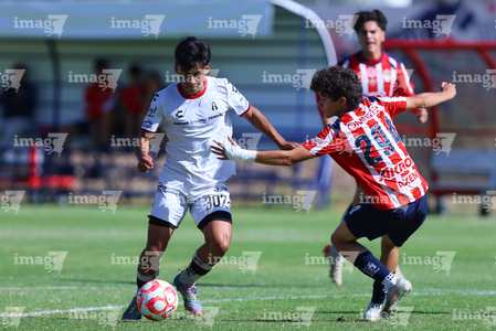 Zapopan, Jalisco, 11 de abril de 2026. Horacio Villarruel y Dilan Ruiz, durante el partido correspondiente a la jornada 14 del torneo Clausura 2026 de la Liga BBVA MX categoría Sub17, entre las Chivas Rayadas del Guadalajara y los Rojinegros del Atlas, realizado en Verde Valle. Foto: Imago7/ Juan Carlos Cubeyro.