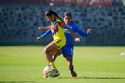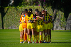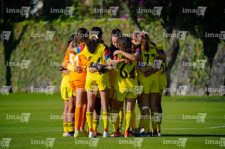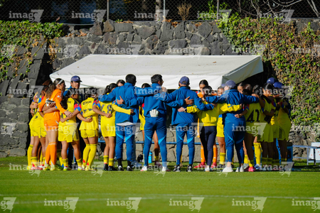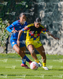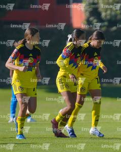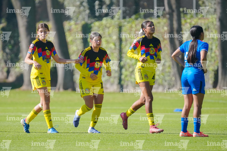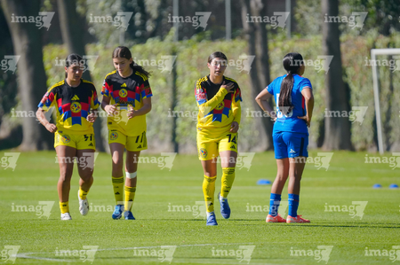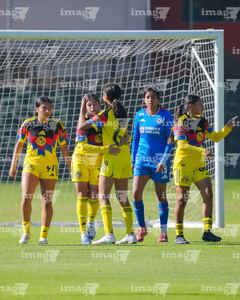 Ciudad de México, 24 de enero de 2026. Jugadoras del América Femenil Sub19, durante el partido correspondiente a la jornada 3 del torneo Clausura 2026 de la Liga BBVA MX Femenil categoría Sub19, entre la Máquina Celeste del Cruz Azul y las Águilas del América, realizado en el Seminario Menor de Acoxpa. Foto: Imago7/ Diego Padilla