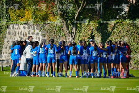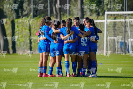 Ciudad de México, 24 de enero de 2026. Jugadoras de Cruz Azul Femenil Sub19, durante el partido correspondiente a la jornada 3 del torneo Clausura 2026 de la Liga BBVA MX Femenil categoría Sub19, entre la Máquina Celeste del Cruz Azul y las Águilas del América, realizado en el Seminario Menor de Acoxpa. Foto: Imago7/ Diego Padilla