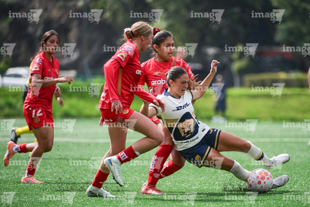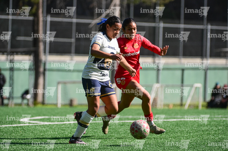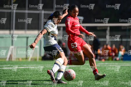 Ciudad de México, 24 de enero de 2026. Yareli Garcia y Natalia Collado, durante el partido correspondiente a la jornada 3 del torneo Clausura 2026 de la Liga BBVA MX Femenil categoría Sub19, entre las Pumas de la UNAM y las Diablas Rojas del Toluca, realizado en Cantera. Foto: Imago7/ Alexis Chávez