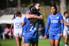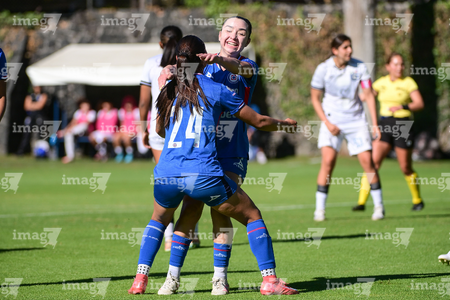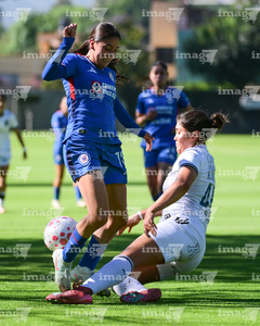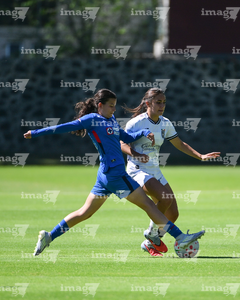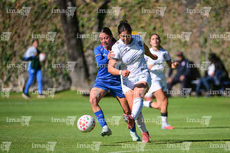 Ciudad de México, 28 de febrero de 2026. Andrea Menendez y Hanna Sánchez, durante el partido correspondiente a la jornada 8 del torneo Clausura 2026 de la Liga BBVA MX Femenil categoría Sub19, entre la Máquina Celeste del Cruz Azul y el Club Querétaro, realizado en el Seminario Menor de Acoxpa. Foto: Imago7/ Alexis Chávez